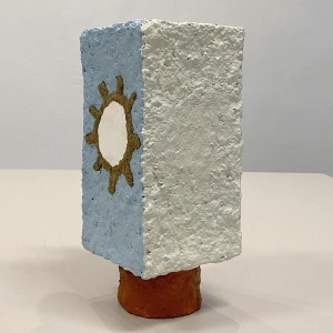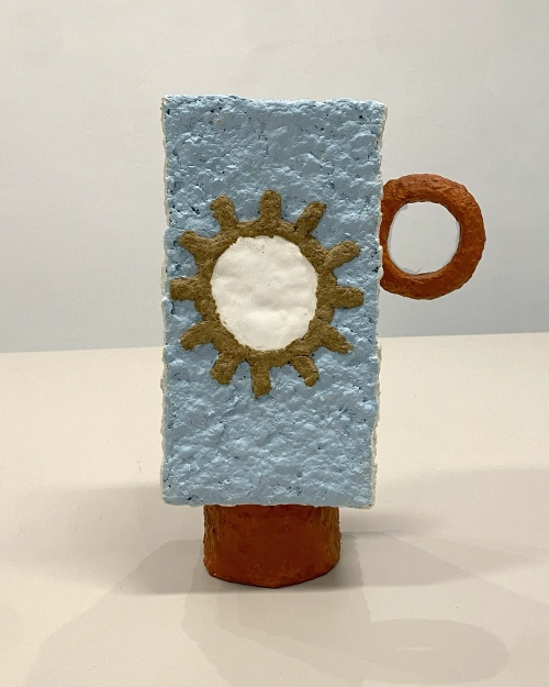 Wazon, donica i lampa to użytkowe obiekty z papier-mâché. Ich konstrukcja opiera się często na odpadach: starych kloszach, abażurach, przypadkowych elementach znalezionych po drodze, a także koralikach zbieranych przez lata. To przedmioty z drugiego obiegu. Nie pełnią roli figur ani totemów, ale wciąż należą do tego samego świata: świata rzeczy, które dostają nowe życie. Są czysto użytkowe, a jednocześnie dekoracyjne – trochę nieporadne, trochę ładne, trochę brzydkie, zawsze jedyne w swoim rodzaju.